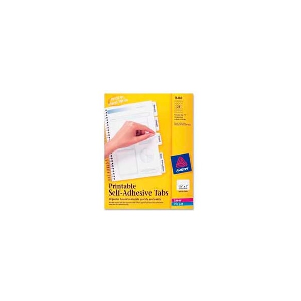 Avery printable self-adhesive tabs, 1-1/4" width, white, 96 tabs/pack print text directly on durable plastic tab using your pc and inkjet or laser printer or write directly on tabs. Attach tabs to edge of any size page to organize and index bound reports, presentations, reference manuals and catalogs. Special adhesive allows tabs to be repositioned when applied but become permanent over time for added security. Each pack includes four sheets of tabs. Avery offers many easy-to-use templates for microsoft word and other popular software programs. larger quantity quotes available. Please call 1-888-978-7759. this product arrives to most customers in 2-3 business days.