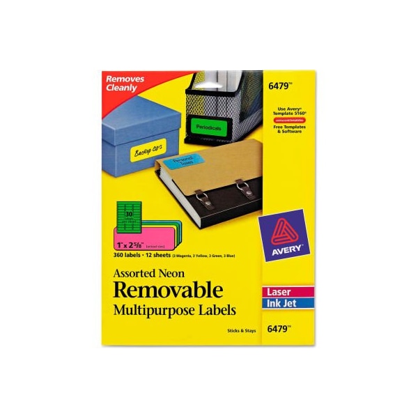 Avery removable self-adhesive multipurpose labels, 1 x 2-5/8, assorted neon, 360/pack capture attention with these high-visibility labels ideal for priority messages, addressing, color-coding, and identification, warning labels and more. Laser and inkjet printer compatible. Label size - text: 1 x 2 5/8; label color(s): assorted neon; machine compatibility: inkjet printers; laser printers; material(s): paper. larger quantity quotes available. Please call 1-888-978-7759. this product arrives to most customers in 2-3 business days.