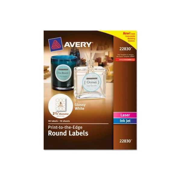Avery round easy peel labels, 2-1/2" dia., glossy, white, 90/pack ideal for creating branding or promotional labels. Colors can extend right to the edge of the label. Avery offers free, easy-to-use templates. Laser and inkjet compatible. Provide vivid colors and sharp text. Label size - text: 2 1/2" dia.; label color(s): white; machine compatibility: inkjet printers; laser printers; material(s): paper. larger quantity quotes available. Please call 1-888-978-7759. this product arrives to most customers in 2-3 business days.