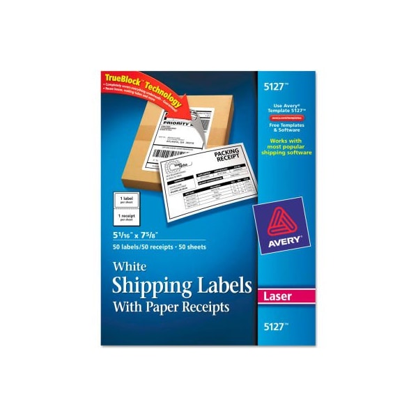 Avery shipping labels with paper receipt, 5 1/16 x 7 5/8, white, 50/pack print postage directly from your desk. Unique sheet construction combines a half sheet label with a half sheet of paper. Takes only one pass through your printer to produce a paper receipt and shipping label. Features trueblocktm technology to completely cover everything underneath, so you can reuse boxes and envelopes over and over again. Easy to use and works with major internet postal service software such as usps click-n-ship, e-bay, paypal and stamps.com. This product was made from wood that came from a certified managed forest. Label size - text: 5 1/16 x 7 5/8; label color(s): white; machine compatibility: laser printers; adhesive: permanent self-adhesive. this product arrives to most customers in 2-3 business days.