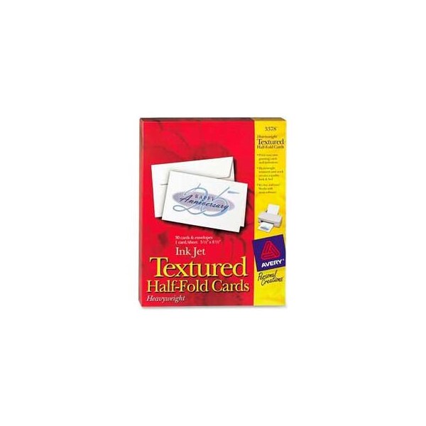 Avery textured half-fold greeting card, 5-1/2" x 8-1/2", white, 30 cards/pack create your own elegant greeting cards, announcements and invitations with these cards and your inkjet printer. The heavyweight textured cardstock projects a quality look and feel. Cards come with matching envelopes. larger quantity quotes available. Please call 1-888-978-7759. this product arrives to most customers in 2-3 business days.