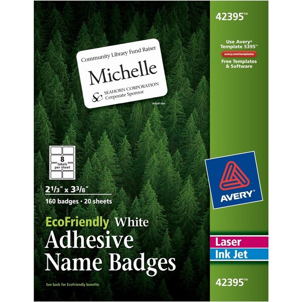 Eco-friendly name badge labels offer a natural choice for getting the job done right and doing right by the environment. Recyclable labels are made with a high percentage of recycled material and a water-based, 100 percent recyclable adhesive. Adhesive is permanent for secure labeling. Avery offers many free, easy-to-use design and print solutions for labels. Labels are compatible with laser and inkjet printers.