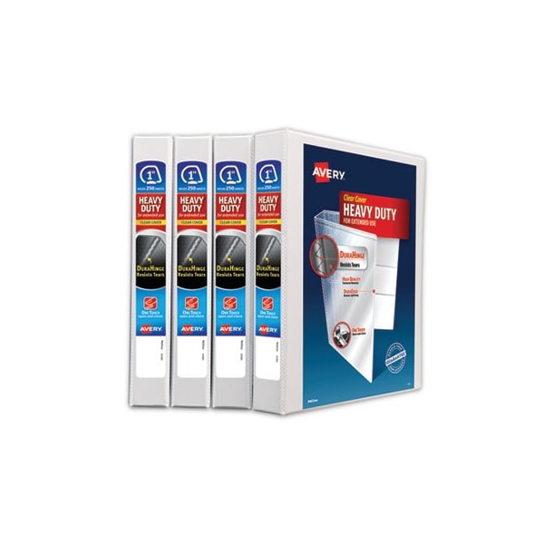 With this Heavy-Duty Nonstick View Binder you get one-touch operation and the durability required for everyday use. Nonstick material won't lift ink or toner off printed pages. Tear-resistant DuraHinge design is stronger and lasts longer. DuraEdge feature makes the sides and top more pliable, providing greater split resistance. Deeply textured film offers a smoother finish and features a linen pattern for a high-quality look and feel. Four clear, interior pockets provide extra storage space. Wider front and back panels fully cover standard dividers and sheet protectors. Slant rings have a higher page capacity when compared to the same size round rings. Pages lie flat with back-mounted rings exposed rivets on back. Customize your title page using free templates and designs at Avery Design & Print Online. Slant RingsHolds more sheets than the same size round rings. Binder Type: Ring; Binder Style: View; Binder Size Capacity: 1in; Binder Sheet Capacity: 250.