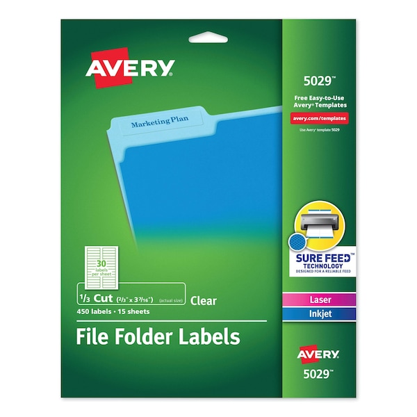 Avery® Clear Permanent File Folder Labels with Sure Feed Technology, 0.66 x 3.44, Clear, 30/Sheet, 15 Sheets/Pack