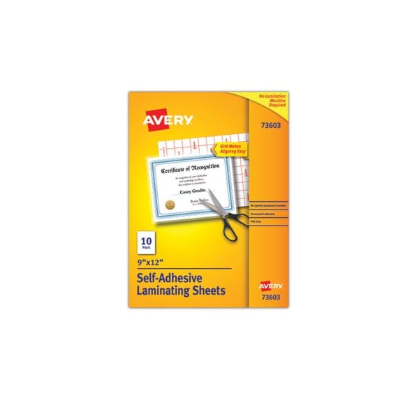 Easily, quickly and inexpensively laminate important documents, precious photos, valuable cards and more using these clear self-laminating sheets. Each laminate sheet is coated with permanent self-adhesive so you can effortlessly create professional quality laminations without having to fuss with lamination machines. Laminating is simple: use the included grid to size the document, place the document on the adhesive side of a laminating sheet, lay the second sheet with its adhesive side down to seal the other side of the document and trim the edges. Made from acid-free and archival safe material, youll be able to preserve and protect documents, diplomas, artwork, photos, collector cards, signs, homemade crafts, stickers and more. You can even turn your laminated sheets into a dry erase board and use a dry erase marker to make notes on them directly. Whether youre a business professional, teacher, student, hobbyist or collector, youll love how easy-to-use and inexpensive Avery lamination sheets are for all your quick laminating projects. Laminator Supply Type: Cold Lamination; Supply Format: Sheet; Suggested Applications: Document; For Use With: No Machine Required.