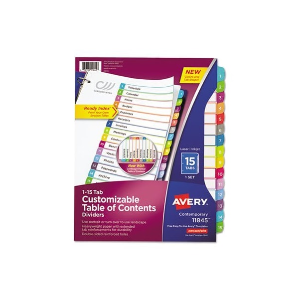 Organized documentation makes a business run like a well-oiled machine. These Ready Index Table of Contents Dividers help you stay organized so you can locate documents quickly and efficiently. They feature preprinted multicolor tabs that can be displayed in either landscape or portrait format. Using free templates from Avery Design & Print you can customize the included table of contents page and print in minutes. Organization and efficiencymakes life better for your business. For laser and inkjet printers. Contemporary Colors. Index Divider Style: Arabic Numeric; Index Divider Size: 11 x 8.5; Punched/Unpunched: 3-Hole Punched; For Use With: Ring Binders.