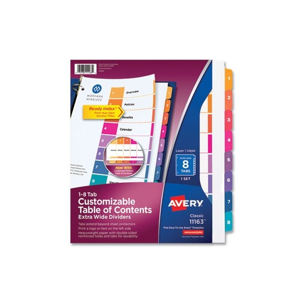 Organized documentation makes a business run like a well-oiled machine. These Ready Index Table of Contents Dividers help you stay organized so you can locate documents quickly and efficiently. They feature preprinted multicolor tabs that can be displayed in either landscape or portrait format. Using free templates from Avery Design & Print you can customize the included table of contents page and print in minutes. Organization and efficiencymakes life better for your business. For laser and inkjet printers. Extra WideTabs extend beyond sheet protectors. Index Divider Style: Arabic Numeric; Index Divider Size: 11 x 9.25; Punched/Unpunched: 3-Hole Punched; For Use With: Ring Binders.