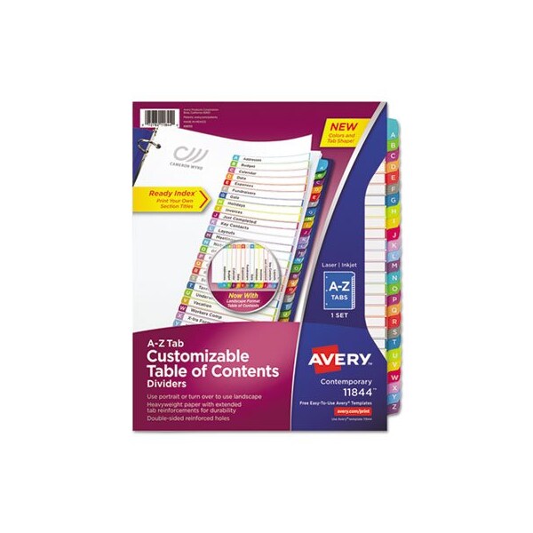 Organized documentation makes a business run like a well-oiled machine. These Ready Index Table of Contents Dividers help you stay organized so you can locate documents quickly and efficiently. They feature preprinted multicolor tabs that can be displayed in either landscape or portrait format. Using free templates from Avery Design & Print you can customize the included table of contents page and print in minutes. Organization and efficiencymakes life better for your business. For laser and inkjet printers. Contemporary Colors. Index Divider Style: Alpha; Index Divider Size: 11 x 8.5; Punched/Unpunched: 3-Hole Punched; For Use With: Ring Binders.