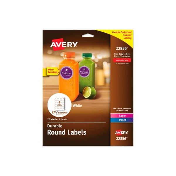 Avery Durable White Round ID Labels, 2-1/2in diameter, White, 72/Pack