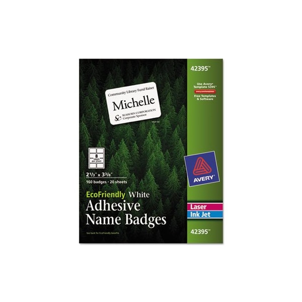 When you're meeting new faces for the first time, be smart with EcoFriendly Adhesive Name Badgesthe labels that work for you. The label paper and packaging are made entirely of recycled materials. Both the product and its packaging are also processed chlorine-free to substantially reduce the harmful substances associated with the manufacturing process. After use, you can maintain your good habits, as both the label paper and packaging are completely recyclable. All pre-printed components of the product employ soy- and vegetable-based inks, which come from renewable materials. With Avery EcoFriendly Name Badges, you can trust in the same high quality you've come to rely on from all Avery products; and with free templates from Avery Design & Print, you can create and customize your name tags in a snap. 8 1/2in x 11in sheets for laser and inkjet printers. Orientation: Horizontal; Name Badge Label Length: 2.33in; Name Badge Label Width: 3.38in; Name Badge Label Colors: White.