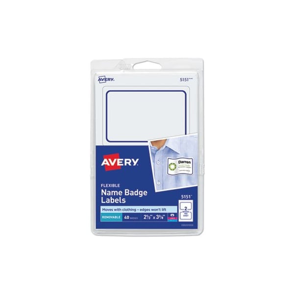 Avery, FLEXIBLE ADHESIVE NAME BADGE LABELS, 3.38 X 2.33, WHITE/BLUE BORDER, 40PK