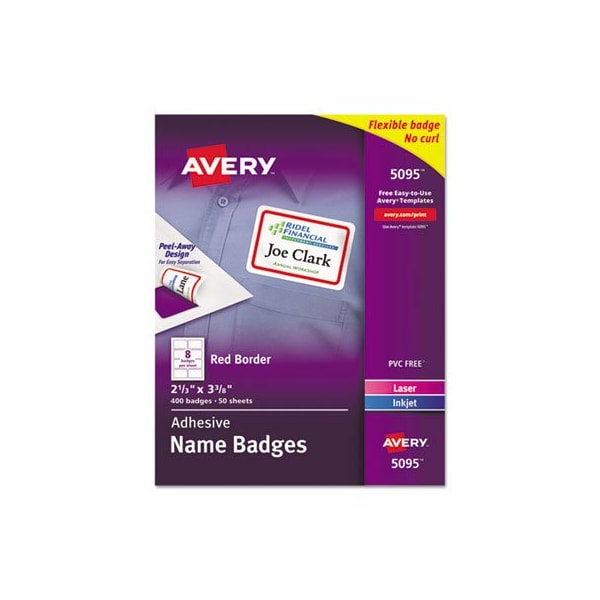 Write directly on them, or use free templates to easily add specialized messages, text, graphics and logos on the spot at meetings or seminars. Improved flexibility allows the badges to move with your clothing, ensuring that they stick securely to fabric without curling at the corners or falling off. Peel-away design allows for quick and easy name badge separation. 8 1/2in x 11in sheets for laser and inkjet printers. Border-Style8.5 x 11 sheets. Orientation: Horizontal; Name Badge Label Length: 2.33in; Name Badge Label Width: 3.38in; Name Badge Label Colors: White/Red.