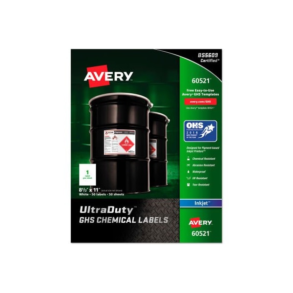 Avery Full-Sheet GHS Chemical Waterproof & UV Resistent Labels, Inkjet, Letter, 50/Pack