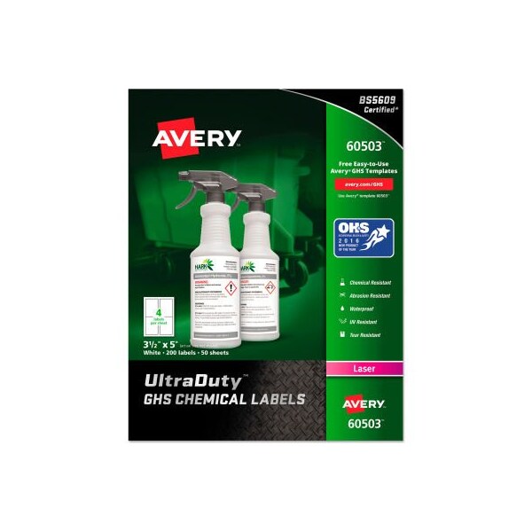 Avery GHS Chemical Waterproof & UV Resistent Labels, Laser, 3-1/2in x 5in, 200/Box