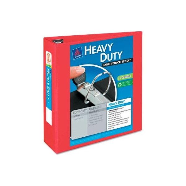 Avery heavy-duty view binder with one touch ezd rings, 3" capacity, red heavy-duty binder for extended use. Clear cover and spine allow you to easily customize your binder. Four interior pockets offer extra storage inside your binder. Wider front and back panels fully cover standard dividers and sheet protectors. One touch ezd rings have a higher page capacity compared to the same size slant or round ring. Gap free ring feature prevents gapping and misalignment of rings. Pages lie flat with back-mounted rings. Heavy-duty, nonstick material won't lift ink or toner off printed pages. larger quantity quotes available. Please call 1-888-978-7759. this product arrives to most customers in 2-3 business days.