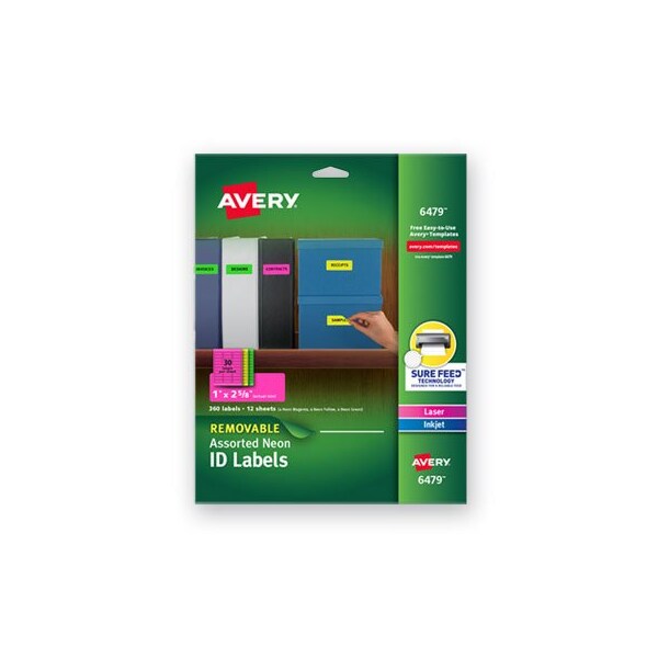 Avery, HIGH-VIS REMOVABLE LASER/INKJET ID LABELS W/ SURE FEED, 1 X 2 5/8, NEON, 360PK