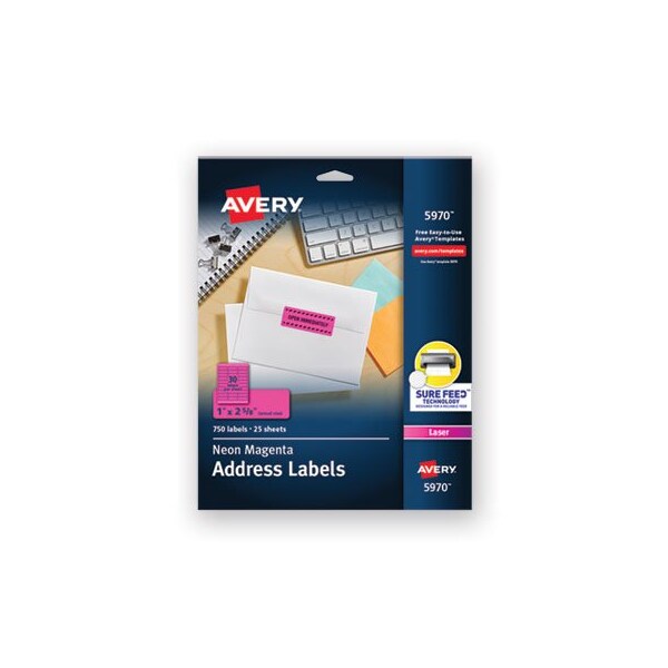 Have something important to say? Customize your white labels with attention-getting images or make your most important messages stand out with high-visibility color labels. Ideal for announcements, priority messages, addressing, color-coding, identification/warning labels and more! Easy to customize with free templates from Avery Design & Print. For laser printers. Now you've got their attention. Laser Permanent Neon Rectangular Labels with Sure FeedEnsuring a reliable printer feed. Shape: Rectangular; Label Size - text: 1 x 2.63; Label Colors: Neon Magenta; Color Family: Purple.