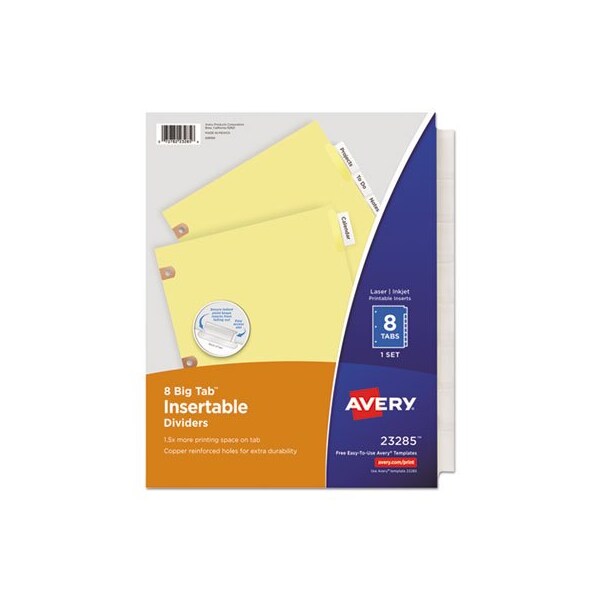 Big Tab dividers are bigger providing 50% more writing space than standard tabs. Special tab design allows easy insertion and removal, but keeps insert securely in place. Reinforced binding edge. White or buff paper dividers with clear or multicolor insertable tabs. It's easy to customize inserts using free templates from Avery Design & Print. Three-hole punched for use in standard ring binders, mini size 5.5 x 8.5 dividers are seven-hole punched for small binders and organizers, and legal size are 4-hole punched for legal size binders. Handwrite or print inserts on laser and inkjet printers. Big Tab Buff PaperSingle-sided copper-reinforced edge. Index Divider Style: Customizable; Index Divider Size: 11 x 8.5; Punched/Unpunched: 3-Hole Punched; For Use With: Ring Binders.