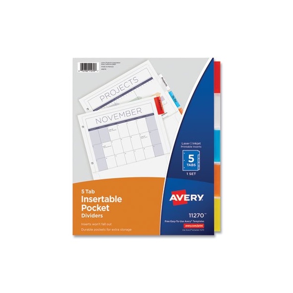 With these convenient pocket insertable dividers, you've got a new method for success. Each divider features a front storage pocket wide enough to hold 8.5 x 11 pages without punching or folding. Stash loose papers, CDs, notes and more. Insertable tabs assist in easy reference. Rip-Proof tabs maintain secure and stable placement. Using free templates from Avery Design & Print it's simple to customize the included tab inserts. These dividers keep your important papers efficiently separated and stored. Handwrite or print inserts on laser and inkjet printers. Index Divider Style: Customizable; Index Divider Size: 11.25 x 9.13; Punched/Unpunched: 3-Hole Punched; For Use With: Ring Binders.