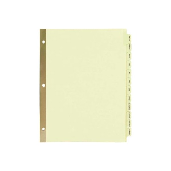 preprinted laminated dividers offer gold ripproof reinforcing that prevents pullout at binder holes. Laminated tabs are printed front and back with easy-to-read characters. Preprinted, monthly tabs range from january to december. Dividers offer quality buff paper and single gold-reinforced binding edges.