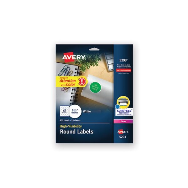 Have something important to say? Customize your white labels with attention-getting images or make your most important messages stand out with high-visibility color labels. Ideal for announcements, priority messages, addressing, color-coding, identification/warning labels and more! Easy to customize with free templates from Avery Design & Print. For laser printers. Now you've got their attention. Laser Permanent White Round Labels with Sure FeedEnsuring a reliable printer feed. Shape: Round; Label Size - text: 1.66in dia; Label Colors: White; Color Family: White.