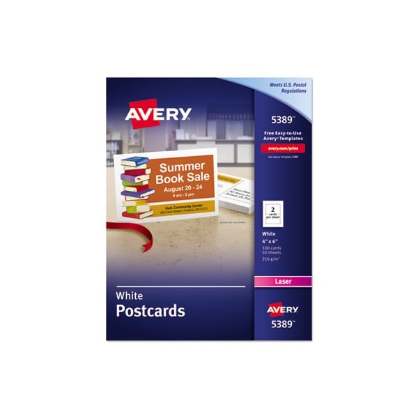 Create professional-looking invitations, announcements, reminders, seasonal offers and more. Sturdy bright white cardstock is either matte-coated for vivid graphics and sharp text or has a premium quality glossy finish ideal for photos. Ultra-fine perforations let you separate cards cleanly and easily. Meets U.S. postal regulations for postcards. Easy to customize with free templates and designs using Avery Design & Print Online. 8.5in x 11in sheets. For Laser Printers. Paper Colors: Uncoated White; Card Height: 4in; Card Width: 6in; Cards Per Sheet: 2.