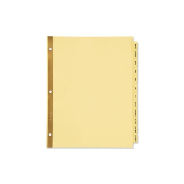 More efficient organization for alphabetical chronological, or numerical sorting. The process becomes simple with handy preprinted tabs to help you get started organizing your paperwork instantly. Gold binding edge is reinforced so you can turn pages secure in the knowledge that your dividers won't tear easily from the binder rings. Easy-to-read black lettering helps you find the right section at a glance. Index Divider Style: Monthly; Index Divider Size: 11 x 8.5; Punched/Unpunched: 3-Hole Punched; For Use With: Ring Binders.