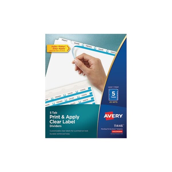 Avery, PRINT AND APPLY INDEX MAKER CLEAR LABEL DIVIDERS, 5 WHITE TABS, LETTER, 25PK