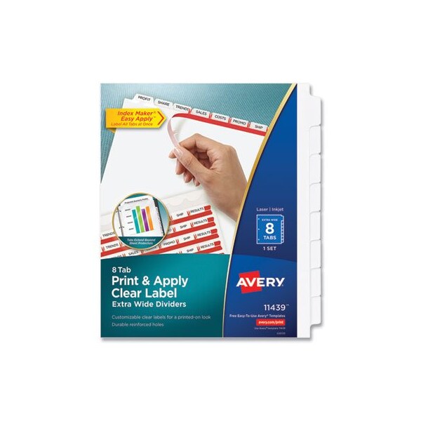 Whether you're organizing a single project or creating multiple sets, Index Maker clear labels virtually disappear on divider tabs to give you a professional printed-on look. The Easy Apply label strip lets you label all tabs at once. Easy to customize with free templates from Avery Design & Print. Big Tab and Extra Wide selections offer greater convenience in office-wide references. Standard and mini size selections provide streamlined indexing in standard binders, planners and small personal binders. For laser and inkjet printers. Extra WideTabs extend beyond sheet protectors. Index Divider Style: Customizable; Index Divider Size: 11.25 x 9.25; Punched/Unpunched: 3-Hole Punched; For Use With: Ring Binders.