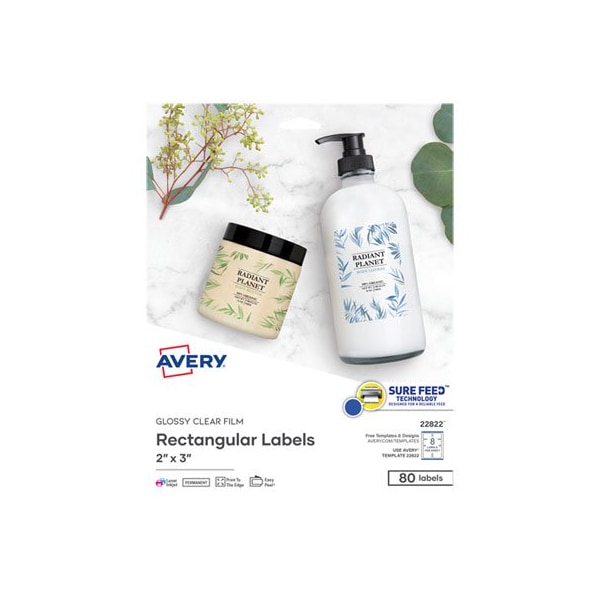 Avery, PRINT-TO-THE-EDGE LABELS W/ SURE FEED & EASY PEEL, 2 X 3, GLOSSY CLEAR, 80PK