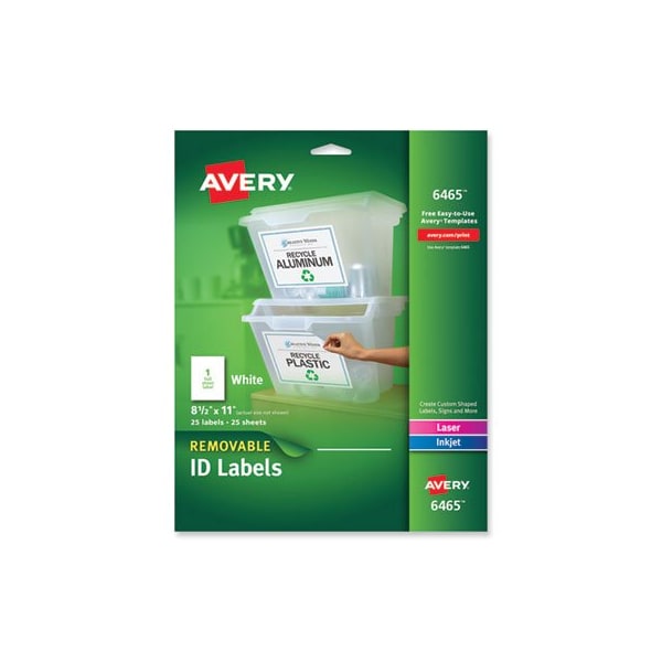 Need a versatile label that sticks around only as long as you want it to? Look no further than these print or write removable labels. Their standard or round size makes them ideal for labeling objects for sale, identifying the contents of containers, marking drawers and shelves and more. With free templates from Avery Design & Print, it's easy to customize the labels and print. Removable adhesive makes the label stay put where you placed it but lets you peel it away easily when the label is no longer needed. With these labels, your labeling needs are met and you control the duration. Identify the contents of containers and label items for sale more quickly and conveniently. Rectangular Labels on 8.5 x 11 Sheets. Shape: Rectangular; Label Size - text: 8.5 x 11; Label Colors: White; Color Family: White.