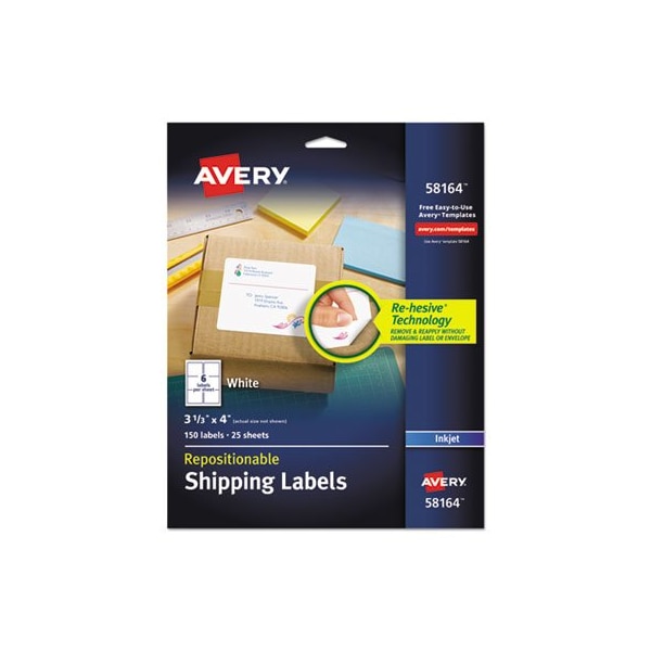 When you want your labels placed just right, count on these repositionable addressing and shipping labels to help you get the job done. It's easy to correct labels placed improperly, upside down or even with the wrong address. With Avery Re-hesive technology, you can remove and reapply without damaging the label or envelope. But over time, the adhesive becomes permanent and will not fall off. Easy to customize with free templates and designs from Avery Design & Print. It's that easy. Shipping Labels for Inkjet Printers. Shape: Rectangular; Label Size - text: 3.33 x 4; Label Colors: White; Color Family: White.