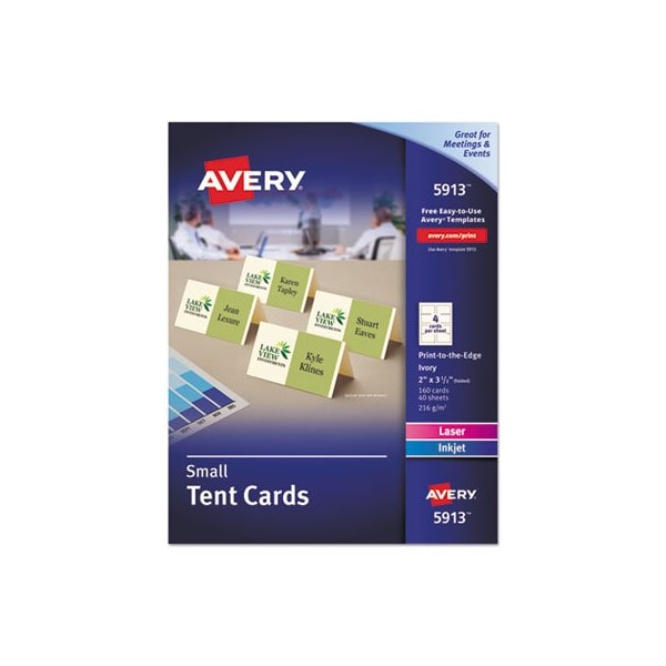 Add a personal touch to parties, events, meetings and celebrations with custom-printed place cards you can print at home. These tent cards feature premium, heavyweight cardstock that stands up to frequent folding, making them perfect for use as place cards, on buffets or as product description cards at boutiques, trade shows or farmers markets. Ultra-fine perforations let you separate cards cleanly and easily and are pre-scored. Personalize and print with our free designs and templates at Avery Design & Print. Bright vibrant colors and sharp clear text can be printed on both sides for a polished, professional look that will add a special feel to any event. 8.5in x 11in sheets for laser and inkjet printers. Print-to-the-Edge with Sure FeedDesigned for color printing that extends to the edge of the card and a reliable print feed. Paper Colors: Ivory; Finished Card Size: 2 x 3.5; Card Quantity: 160; Sheet Quantity: 40.