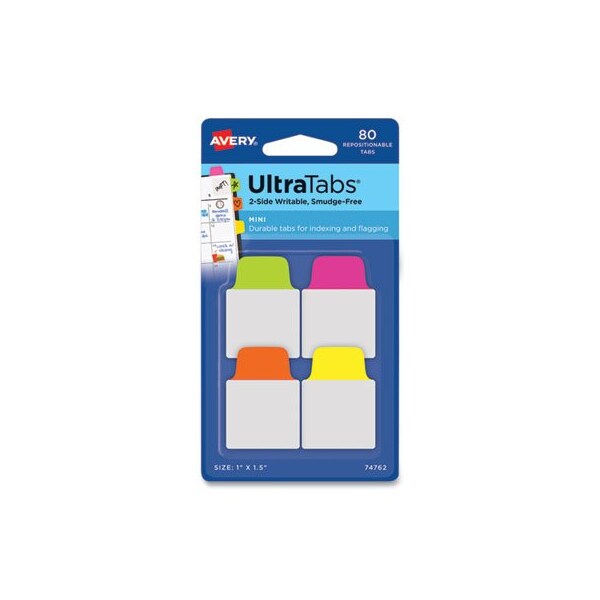 Avery, ULTRA TABS REPOSITIONABLE MINI TABS, 1/5-CUT TABS, ASSORTED NEON, 1in WIDE, 80PK