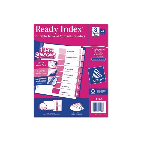 Avery Uncollated Index Divider, Printed 1 to 8, 8.5"x11", 8 Tabs, 24 Sets, White/Multicolor