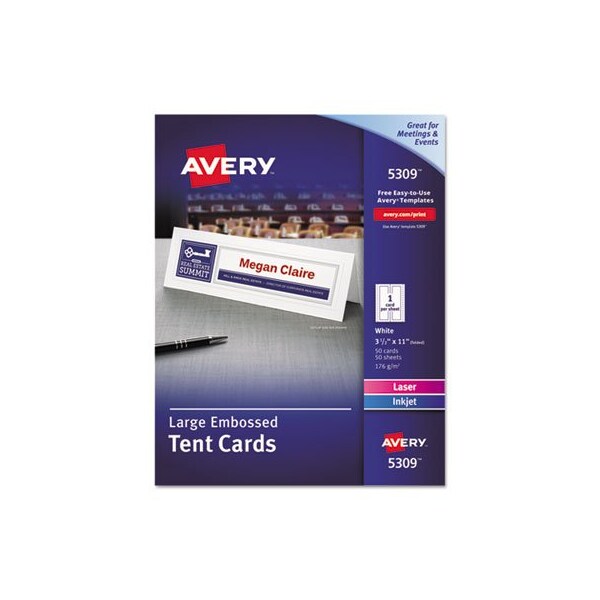 Add a personal touch to parties, events, meetings and celebrations with custom-printed place cards you can print at home. These tent cards feature premium, heavyweight cardstock that stands up to frequent folding, making them perfect for use as place cards, on buffets or as product description cards at boutiques, trade shows or farmers markets. Ultra-fine perforations let you separate cards cleanly and easily and are pre-scored. Personalize and print with our free designs and templates at Avery Design & Print. Bright vibrant colors and sharp clear text can be printed on both sides for a polished, professional look that will add a special feel to any event. 8.5in x 11in sheets for laser and inkjet printers. Embossed DesignFor a professional appearance. Paper Colors: White; Finished Card Size: 3.5 x 11; Card Quantity: 50; Sheet Quantity: 50.