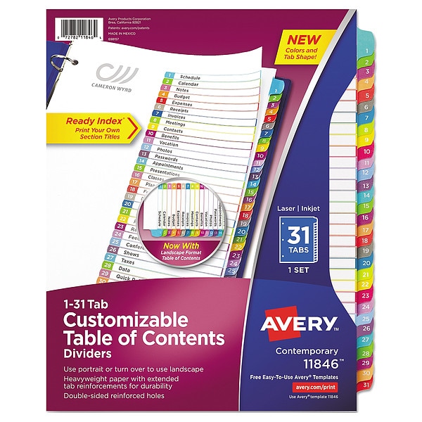 Organized documentation makes a business run like a well-oiled machine. These Ready Index Table of Contents Dividers help you stay organized so you can locate documents quickly and efficiently. They feature preprinted multicolor tabs that can be displayed in either landscape or portrait format. Using free templates from Avery Design and Print you can customize the included table of contents page and print in minutes. Organization and efficiency-makes life better for your business. For laser and inkjet printers.