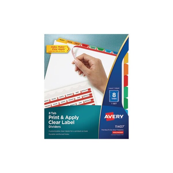 Organization is made easy with Index Maker Dividers. Whether you're coordinating a single project or multiple binder sets, these dividers let you to get it done quickly and easily, with professional results. The clear labels virtually disappear on the tabs, giving your dividers a clean, printed-on look. Save time with the Easy Apply strip that lets you label all the tabs at once, making it simple to create custom dividers right from your desktop. Just use the free templates from Avery Design & Print and you can personalize and print your Easy Apply tab labels in minutes. With these dividers you get a professional, easy-to-use solution to keep all your projects organized. For laser and inkjet printers. Traditional Color Tabs. Index Divider Style: Customizable; Index Divider Size: 11 x 8.5; Punched/Unpunched: 3-Hole Punched; For Use With: Ring Binders.