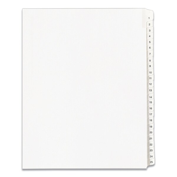 Use these dividers to organize index briefs, legal exhibits, mortgage documentation files and more. The crisp and clean white paper stock dividers give files a professional appearance. The durable Rip ProofTM reinforced tabs are preprinted on both sides so information can be located easily. The unpunched binding edges mean these indexes can fit practically any binding system.