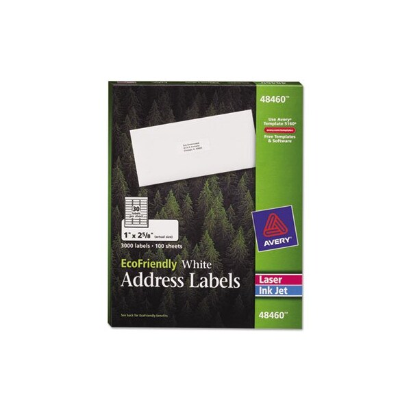 These versatile ecofriendly address or shipping labels work for you, and the environment. With our free templates and designs from Avery Design & Print, you can transform your mailing lists into customized labels in minutes. They're also great to use with personalized gifts, crafts, organization and identification. The label paper and packaging is made of entirely of recycled materials and processed chlorine free. Both are printed using soy- and vegetable-based inks and both are recyclable. Just a little step to leaving a smaller footprint. Mailing Address LabelsIncludes Easy Peel feature. Shape: Rectangular; Label Size - text: 1 x 2.63; Label Colors: White; Color Family: White.