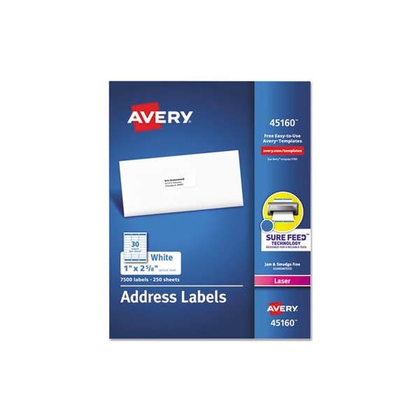 Large bulk pack size perfect for multiple and high-volume mailing projects, labeling bottles, jars, food containers, product branding, event decorations, and more. White Address Labels are great when you want to create professional labels quickly and easily. Sure Feed technology is designed for a reliable feed through your printer helping prevent misalignments and jams. To easily customize your labels, simply use the free templates and designs from Avery Design & Print. 8 1/2in x 11in sheets, optimized for laser printers. Value PackStock up and save! Shape: Rectangular; Label Size - text: 1 x 2.63; Label Colors: White; Color Family: White.
