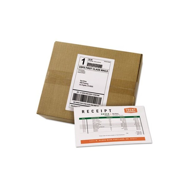 Efficient design combines the shipping label and paper receipt onto one sheet with a perforation so you can easily separate the two. Easily create distinctive shipping labels that leave a lasting impression. For use with popular shipping software including USPS Click-N-Ship, Stamps.com, UPS, FedEx, eBay and PayPal. Print your labels, with or without postage, directly from your shipping software, or use the free templates using Avery Design & Print avery.com/print to enter shipping details as well as your own logo or design. For laser and inkjet printers. Shape: Rectangular; Label Size - text: 5.06 x 7.63; Label Colors: White; Color Family: White.