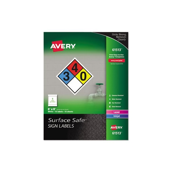 Easily create cost-effective removable label signs that will help maintain a safe workplace without damaging walls and paint. Made of durable, professional-grade material, and engineered to resist water, chemicals and hold up to wear and tear in warehouses and on the manufacturing floor. Specially designed Surface Safe adhesive sticks securely yet removes cleanly from painted walls, drywall, metal and glass without any residue or damage to surfaces. For laser and inkjet printers - no special label or sign printer required. Customize and print using Avery Design and Print software. Choose from hundreds of stock designs that are compliant with ANSI and OSHA, or customize your own. Shape: Rectangular; Label Size - text: 8 x 8; Label Colors: White; Color Family: White.