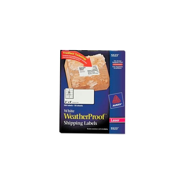 Don't let a little rain or snow worry you when you need to send a package. Waterproof labels stand up to the toughest environmental conditions and extreme temperatures, while resisting scuffs, tears and smudges, so they remain easy to read. Ultrahold Adhesive sticks to more tough surfaces: metal, plastic, glass and more, ensuring your label doesn't fall off your package. They also resist. TrueBlock Technology completely covers everything underneath your label, so you can reuse boxes, mailing tubes and more. With free printable templates and designs from Avery Design & Print, you can create custom labels with sharp text and graphics in minutes. Waterproof and UV-resistant. 8.5in x 11in sheets for laser printers. Shipping Labels with Sure FeedDesigned for a reliable printer feed. Shape: Rectangular; Label Size - text: 2 x 4; Label Colors: White; Color Family: White.