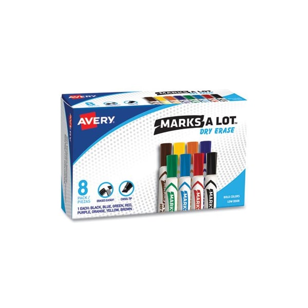 Ink is formulated to erase easily and cleanly. Improved color vibrancy and long-lasting writing. Marks on whiteboard, glass, and other nonporous surfaces. Durable chisel tip marks in a variety of widths. Cap can be left off for 24 hours without dry-out. Safe to use at home or school. Low odor, non-toxic. Marker Ink Type: Dry Erase; Marker Tip Type: Chisel; Marker Tip Size text: Broad; Marker Tip Size numeric: 4.8 mm.