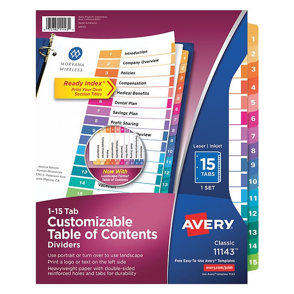 Organized documentation makes a business run like a well-oiled machine. These Ready Index Table of Contents Dividers help you stay organized so you can locate documents quickly and efficiently. They feature preprinted multicolor tabs that can be displayed in either landscape or portrait format. Using free templates from Avery Design & Print you can customize the included table of contents page and print in minutes. Organization and efficiency-makes life better for your business. For laser and inkjet printers.