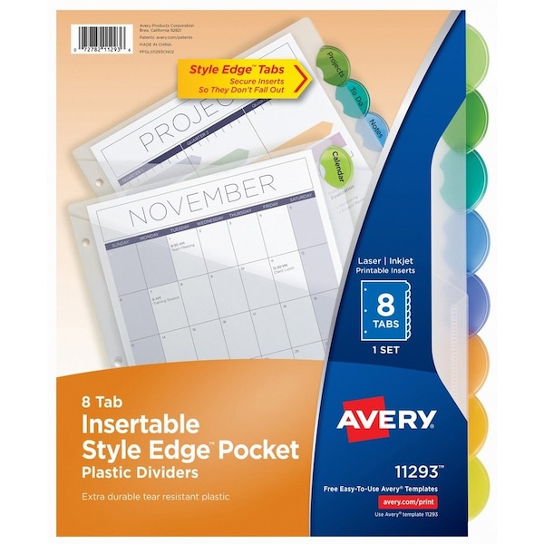 With these Insertable-style Edge Plastic Dividers with Pockets, you get a fashionable look, easy referencing and extra storage all in one. Letter-size dividers are made from durable, translucent plastic for long-lasting use and feature sturdy pockets for storing loose papers. Unique, oval tab design gives you a fashionable look while keeping your inserts from falling out. Simply customize and print your inserts for your eight tabs using the free online templates and designs. Three-hole punched edge means the dividers are ready to use.