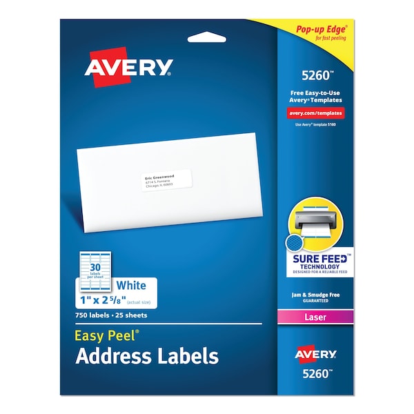 Avery® Easy Peel White Address Labels w/ Sure Feed Technology, Laser Printers, 1 x 2.63, White, 30/Sheet, 25 Sheets/Pack