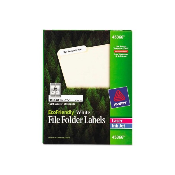Avery ecofriendly labels, 2/3 x 3-7/16, white, 1500/pack natural choice for getting an organized look. Ecofriendly labels are made of recycled material and a water based 100% recyclable adhesive. Processed chlorine free and printed using soy based ink. Labels and packaging are recyclable as part of paper waste. Avery offers free, easy-to-use templates. 8 1/2 x 11 sheets for laser and ink jet printers. Label size - text: 2/3 x 3 7/16; label color(s): white; machine compatibility: inkjet printers; laser printers; material(s): paper. this product arrives to most customers in 2-3 business days.