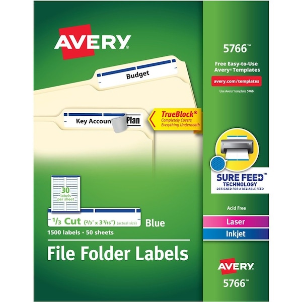 Create professional-looking file folder labels for easy and quick file identification. Labels with TrueBlock completely cover everything underneath so you can reuse mailing tubes, boxes and more. Bright white labels have permanent adhesive that sticks without lift or curl. Each sheet of labels is acid-free, jam-free and smudge-free. Each sheet has labels sized to fit 1/3-cut tabs. File folder labels are compatible with inkjet and laser printers. Avery offers many easy-to-use templates for Microsoft Word and other popular software programs.